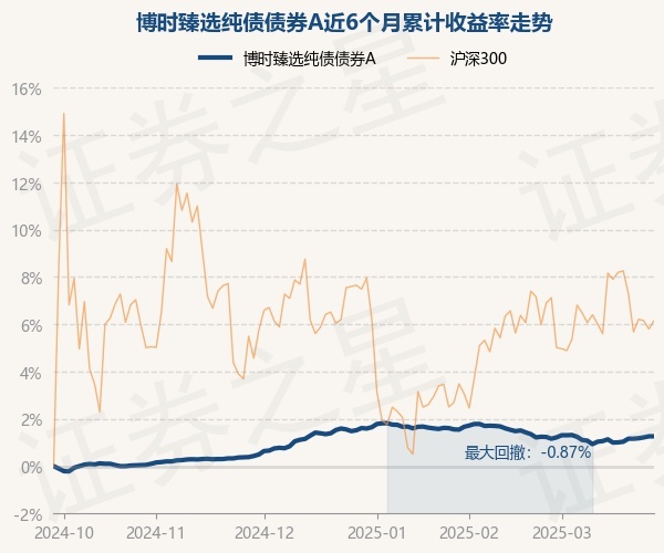 本站消息,3月27日,博时臻选纯债债券A最新单位净值为1.1069元,累计净值为1.2989元,较前一交易日上涨0.0%。历史数据显示该基金近1个月上涨0.1%,近3个月下跌0.34%,近6个月上涨1.26%,近1年上涨3.28%。该基金近6个月的累计收益率走势如下图: